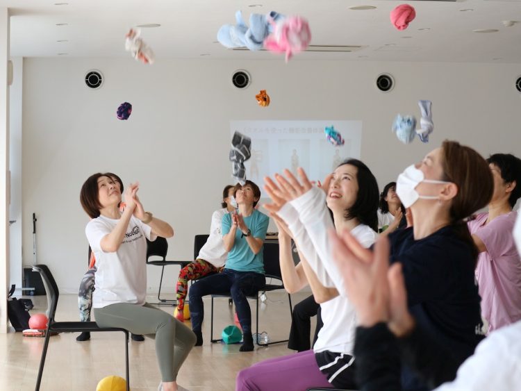 午前中の椅子に座ってできる機能改善体操セミナー〜タオル&ボール編〜(茂木伸江)では、高齢者の運動指導に必要な知識を学び、後半はエクササイズを体験していただきました。