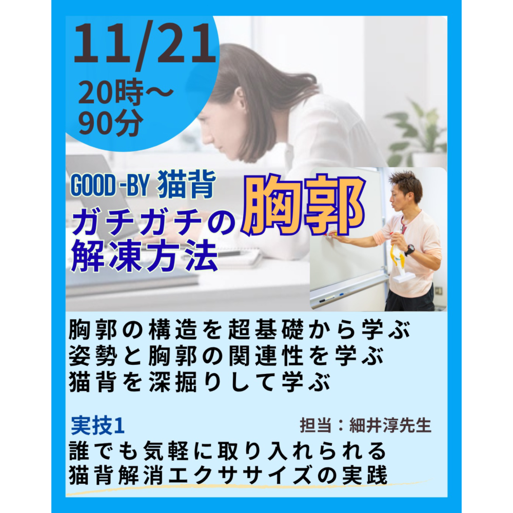 11月21日.12月5、19日 ゼロから学ぶ身体の勉強アルファベットシリーズ2025〜理学療法士・細井淳先生と学ぶ「胸郭」実技で身体に落としこむコンディショニングセミナー〜